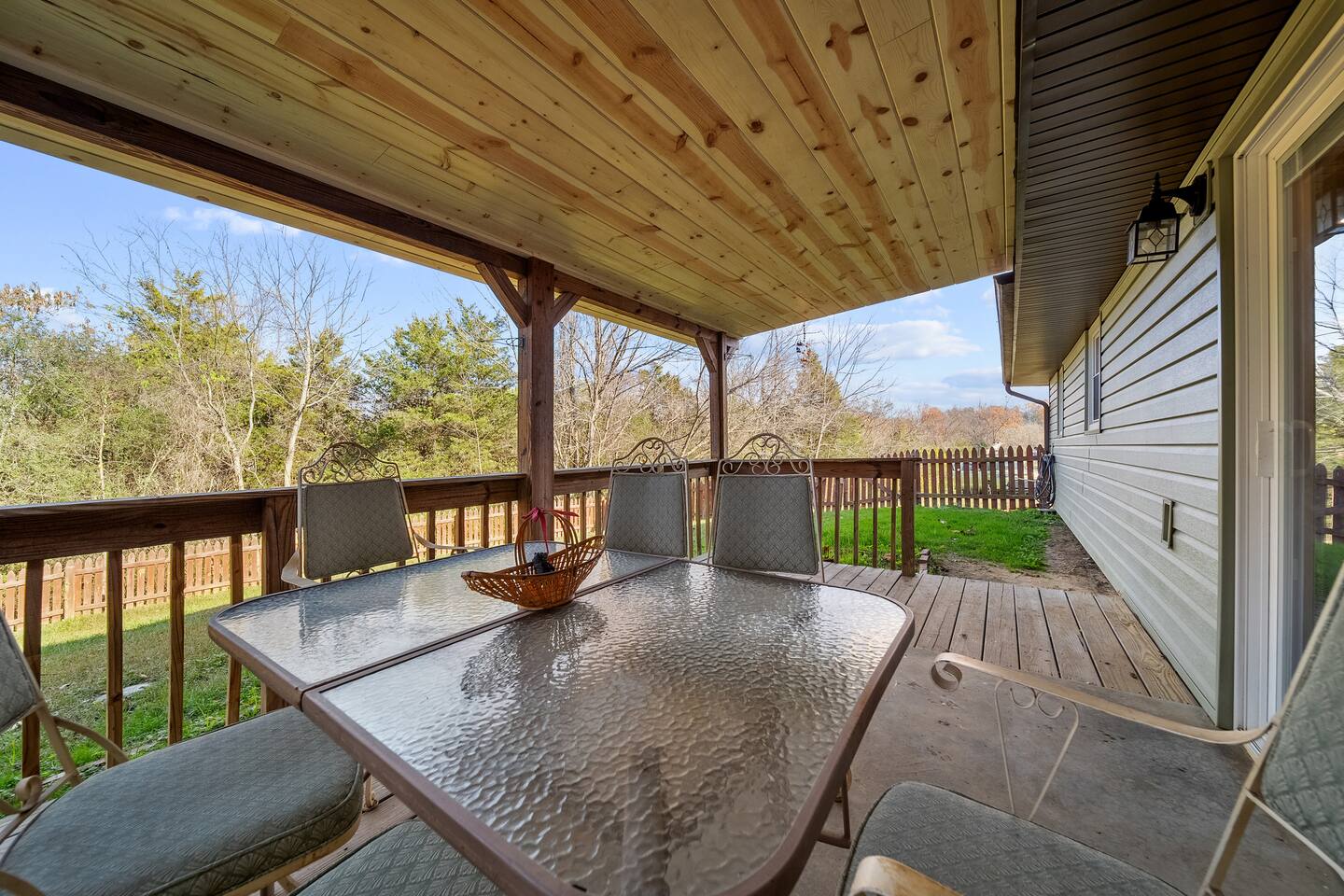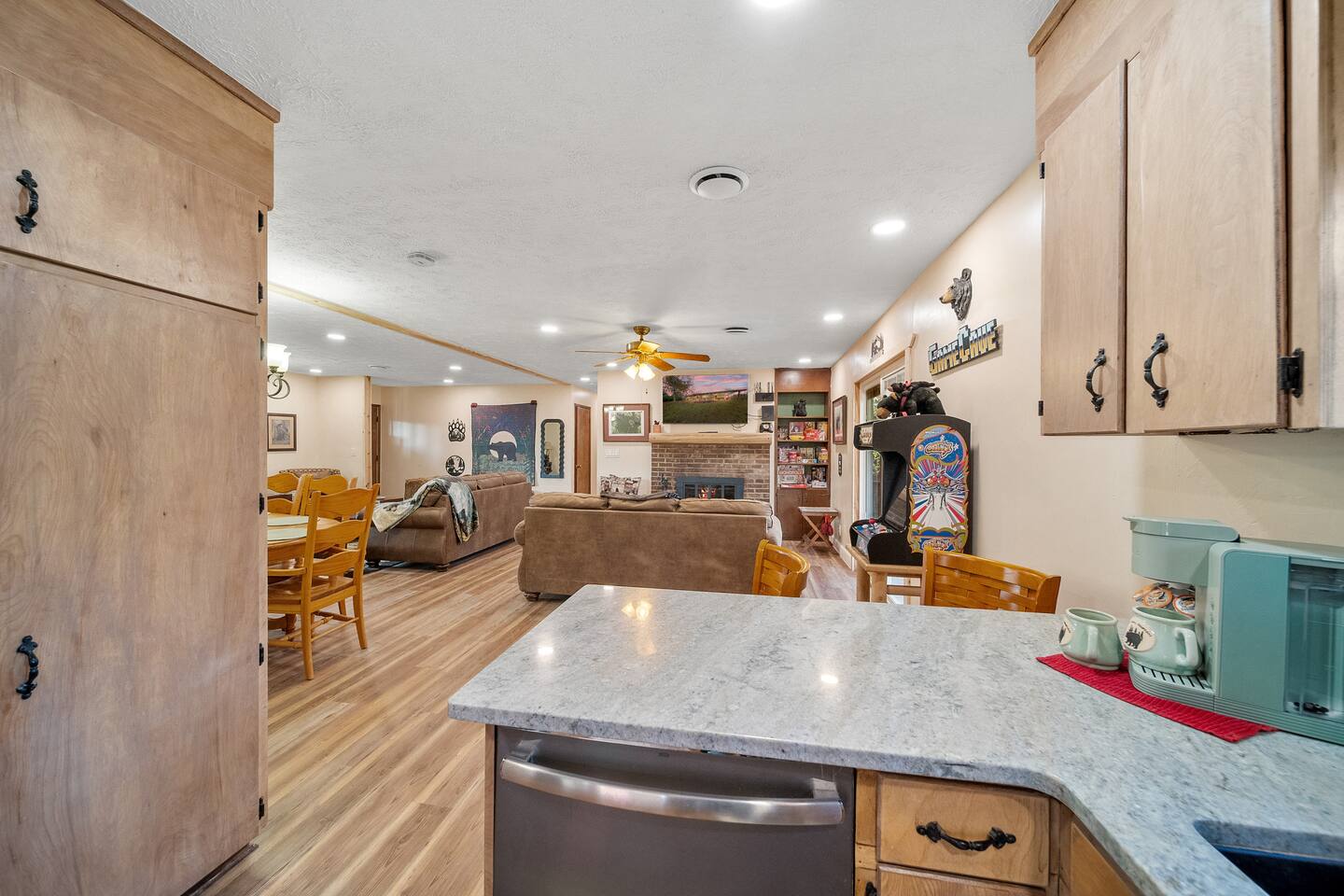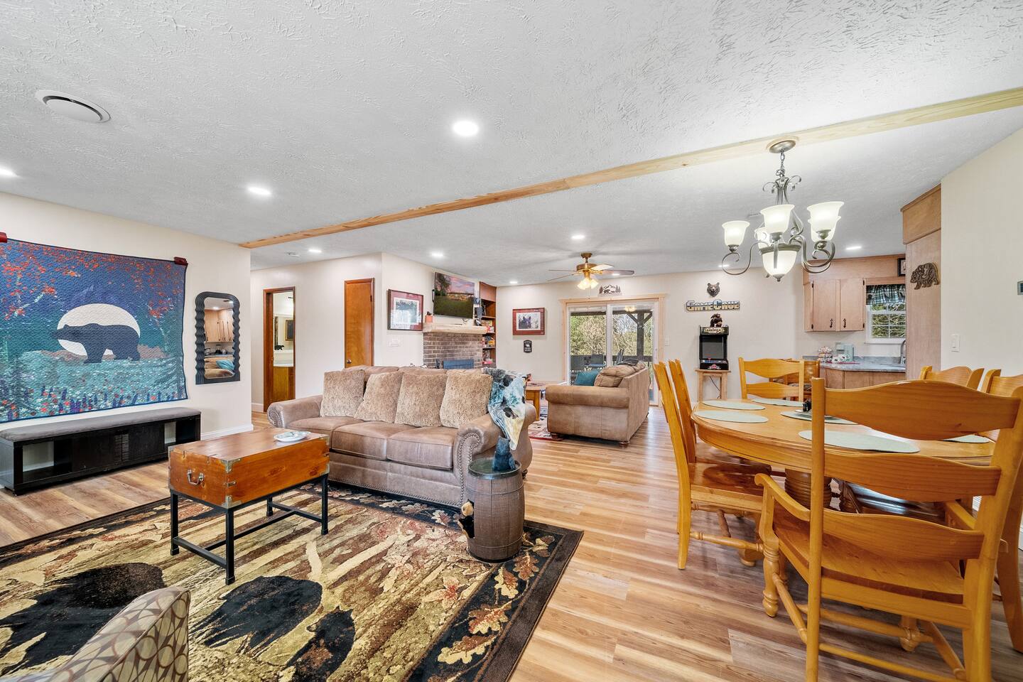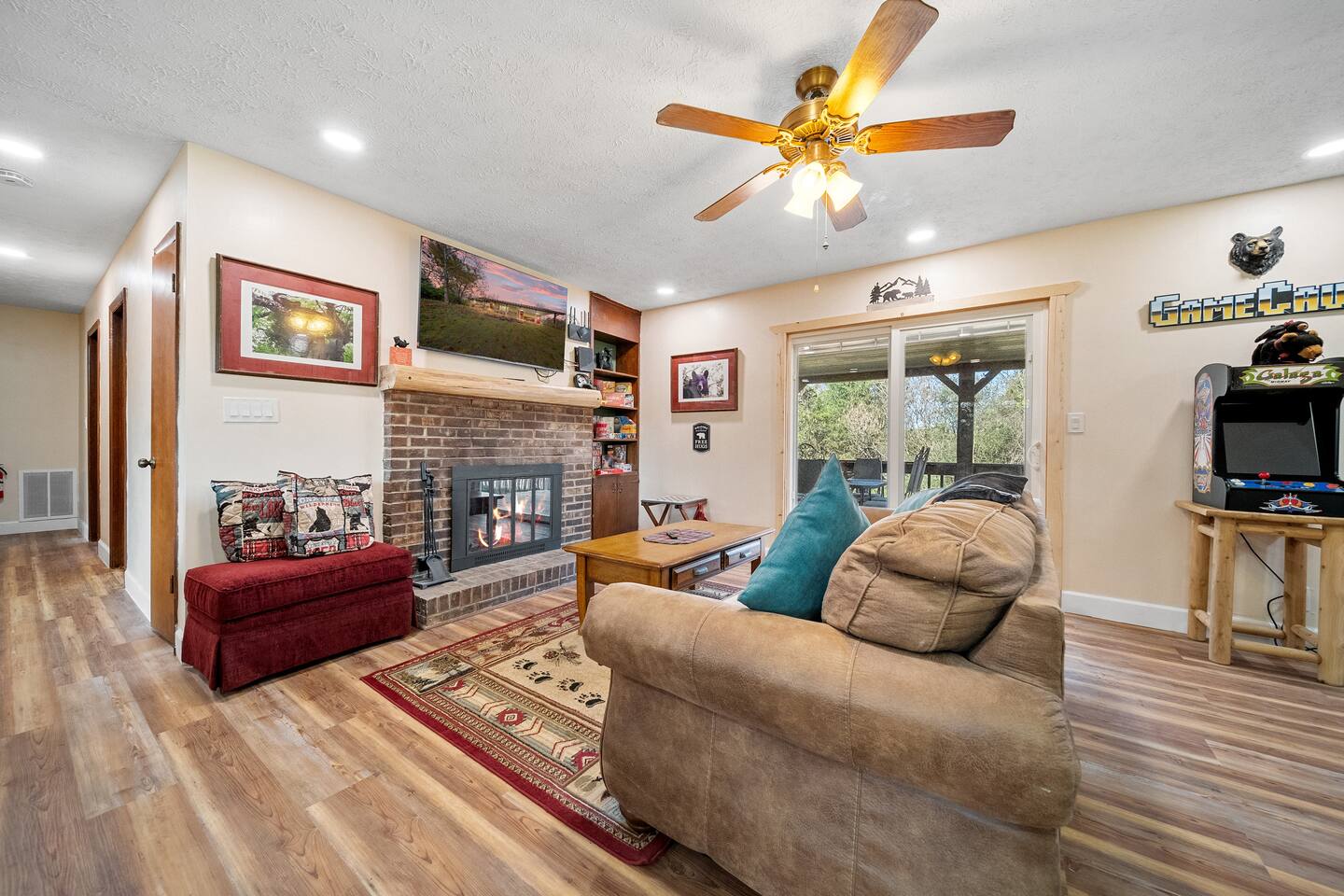 Enjoy beauty, peace and privacy paired with easy access to everywhere, in this well-located 3/2 entire Sevierville home. Features: King bed with en-suite bathroom; two queen bedrooms; an open living/dining room overlooking the treed front yard; den and kitchen viewing the fenced-in yard and porch; Wifi; dedicated workspace; fireplace; arcade games; full kitchen; and wash/dryer. 2 miles to groceries/restaurants, 3 mi to Sevier Co. Convention Ctr, 7 mi to The Island, and 8 mi to Dollywood.
