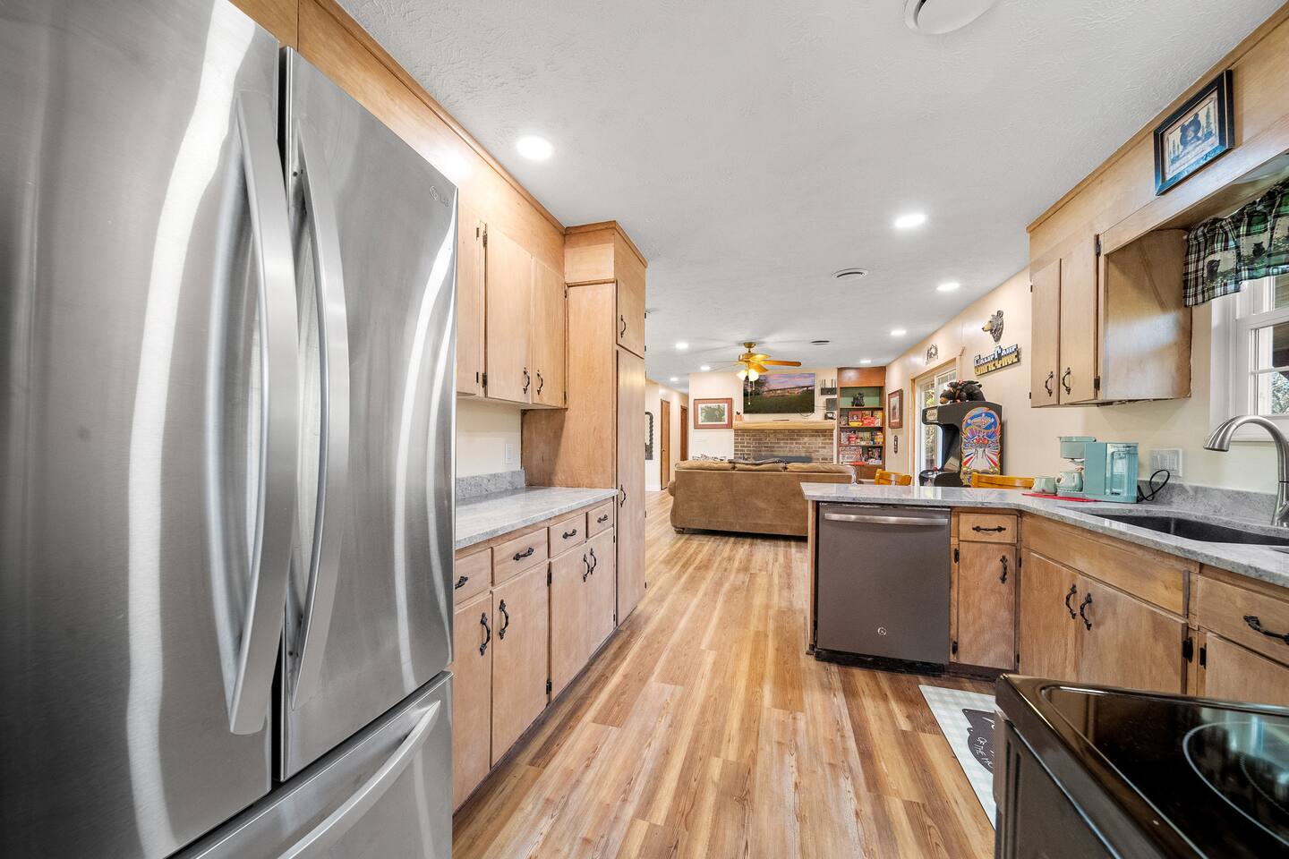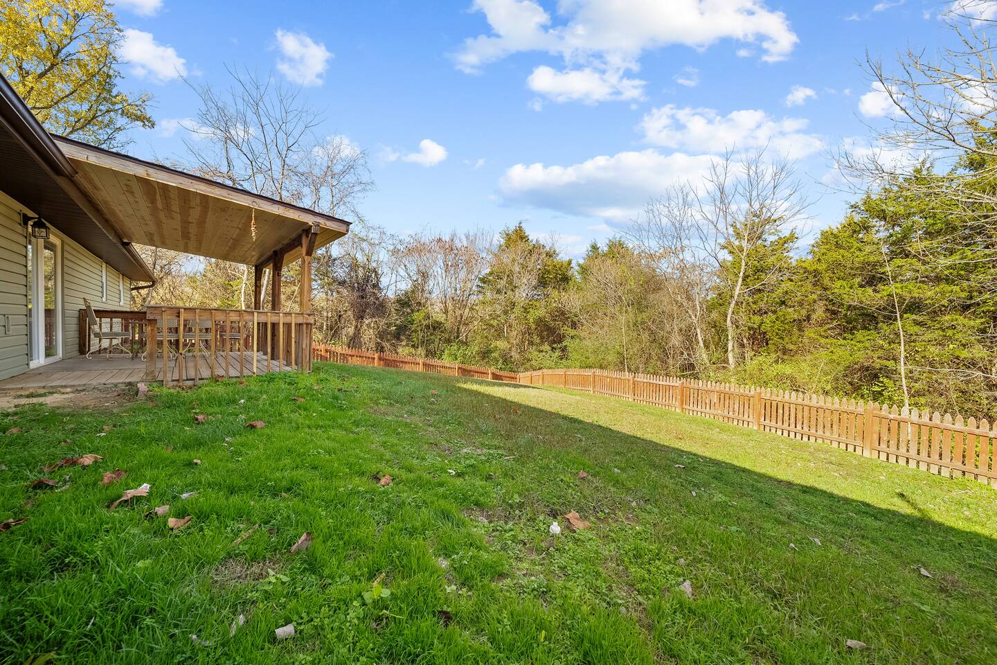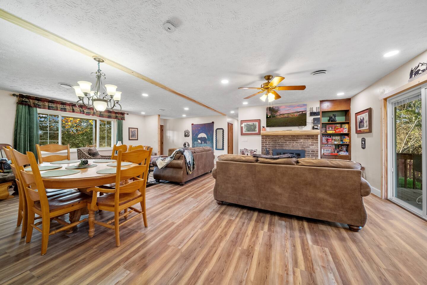 Enjoy beauty, peace and privacy paired with easy access to everywhere, in this well-located 3/2 entire Sevierville home. Features: King bed with en-suite bathroom; two queen bedrooms; an open living/dining room overlooking the treed front yard; den and kitchen viewing the fenced-in yard and porch; Wifi; dedicated workspace; fireplace; arcade games; full kitchen; and wash/dryer. 2 miles to groceries/restaurants, 3 mi to Sevier Co. Convention Ctr, 7 mi to The Island, and 8 mi to Dollywood.