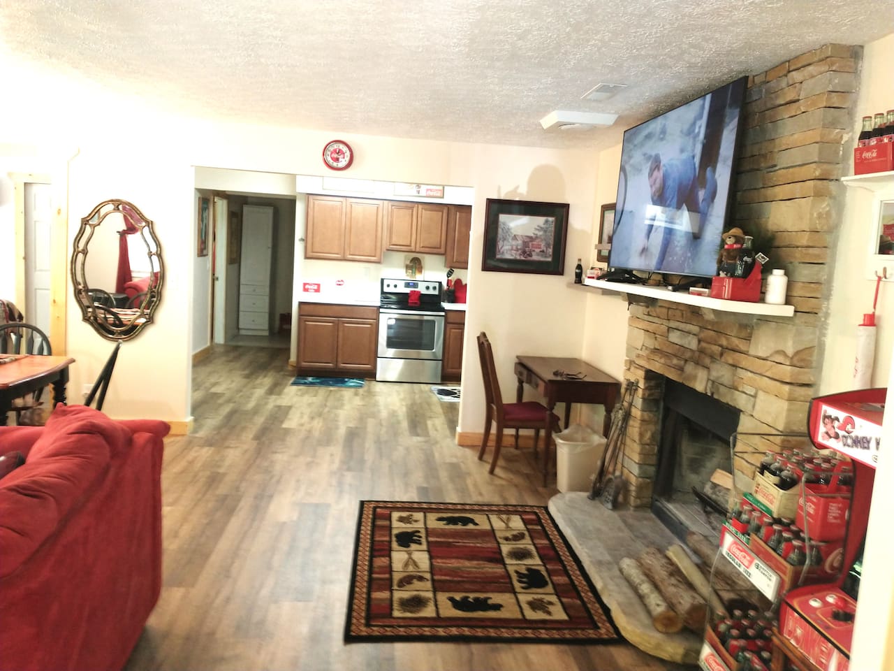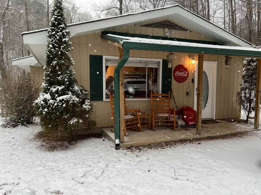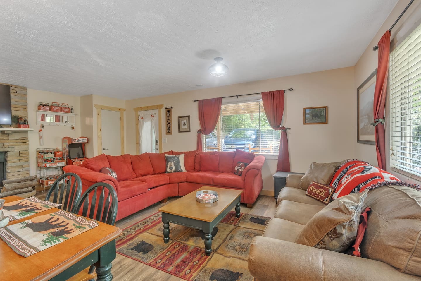 Our Cabin is perched on a hill so that you feel you are high up in the tree tops of Gatlinburg. As you enter the home, you will be welcomed into a spacious living and dining area with a fireplace, 2 couches, and a 60 inch flat panel TV, and arcade video game with over 100 games. We have a fully equipped kitchen and table with seating for 6 . We have a private driveway that will fit 3 cars. Relax and unwind, taking in the idyllic scenery in this spacious two bed, two bath cabin on a hill with the forest just feet from the back yard. Prepare meal for your family in the fully equipped kitchen, then enjoy it outside by the fire pit or inside by the cozy stone fireplace. WiFi Firepit wood burning fireplace Smart TVs- plus 1 TV w/Roku box, to stream Outdoor dining furniture Porch rocking chairs Board games Fully stocked kitchen Washer and dryer Gated backyard Charcoal grill Off-street parking up to 3 cars arcade games pet friendly with fee (Sorry no cats due to allergies). Pets need pre-approval. MEMORIES: It is truly the perfect place to make life long memories. The moment you arrive you know this is a special place. Whether you relax on the rockers on the front porch, snuggle by the fireplace, grill that perfect steak or just check out the ever changing view of the foliage as the sun sets. At the end the day, it is our desire in sharing our Den that you put you feet up and recollect on all the memories you created that last a lifetime. We always recommend 4X4 drive for anywhere in The Great Smoky Mountains during winter or when exploring more rugged areas in the mountain. Our cabin features paved road all the way up to the front porch, no steps. Without any inclement weather any car should be fine but again, we recommend all wheel drive when visiting the area.