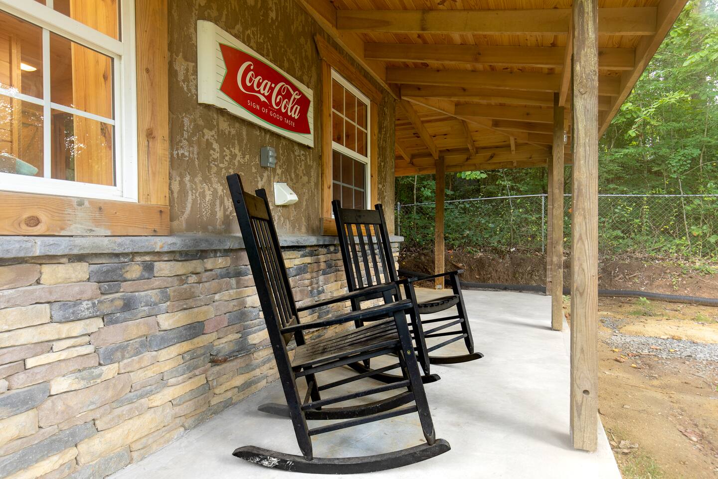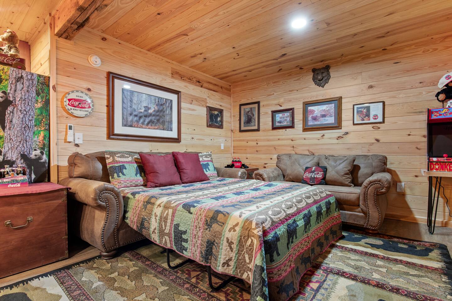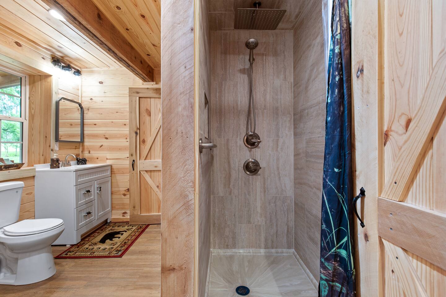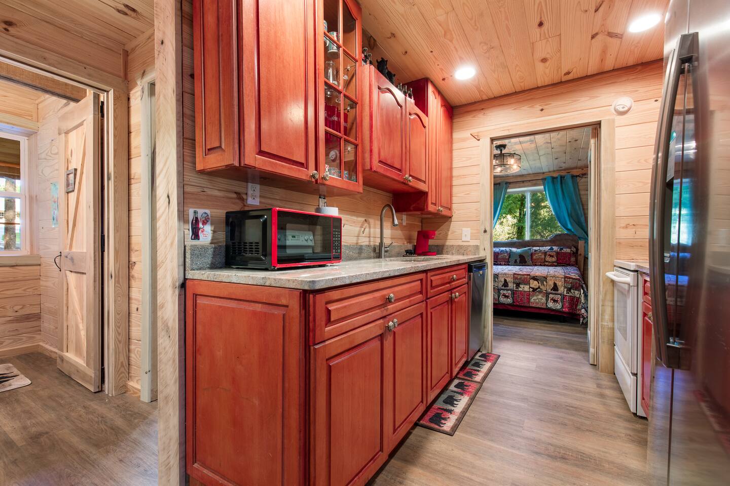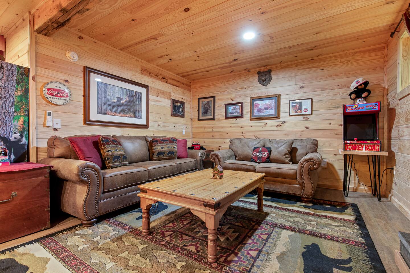1 bedroom, 1.5 bath entire ground-floor hideaway, below a split-level log cabin. Easy access. No scary roads! 1 king bed, and 1 queen sofa bed., with TV in each sleeping space. Private driveway/entrance, large covered front porch, 1.5 miles to historic Harrisburg Bridge, 3 miles to tubing, 8 miles to Dollywood, 12 miles to The Island/ Pigeon Forge, 15 miles to Buc-ee's, 17 miles to Aquarium/Gatlinburg, 18 miles to GSM Nat'l Park Porter Trailhead, and 32 miles to Pigeon River rafting .
