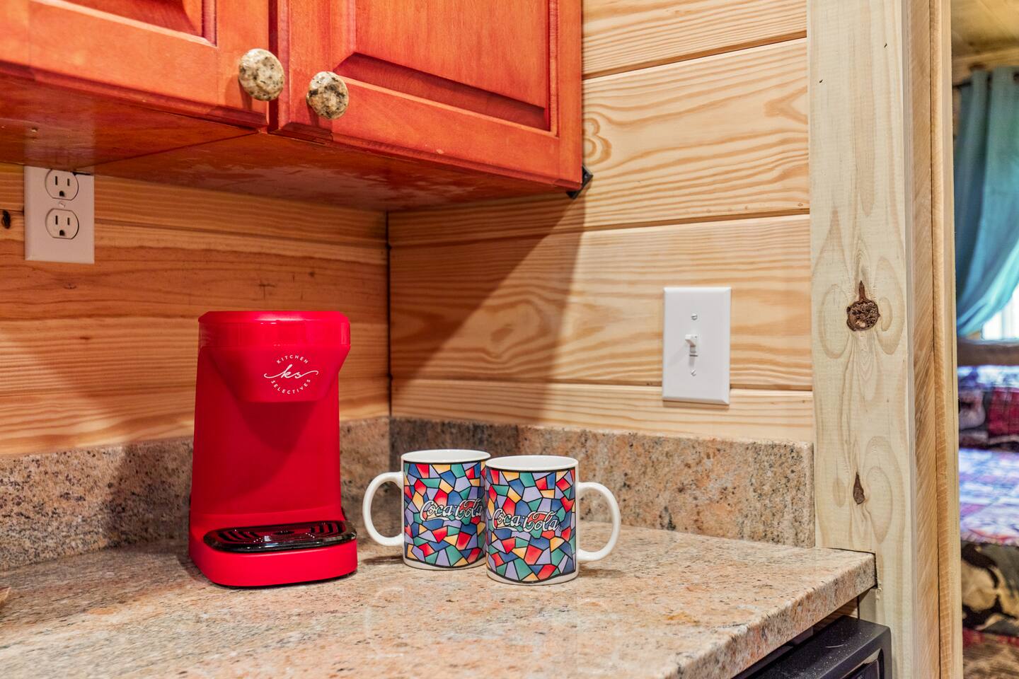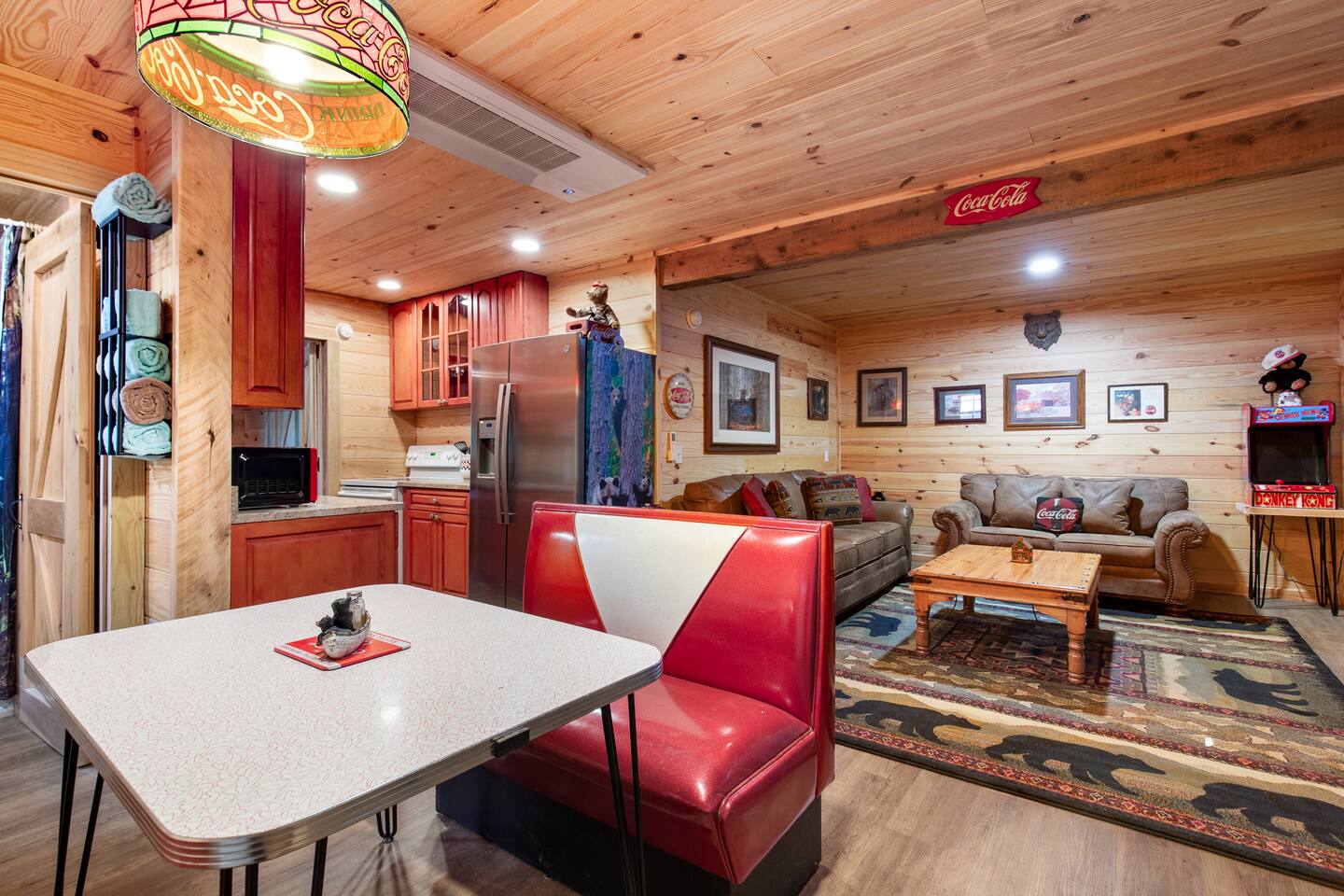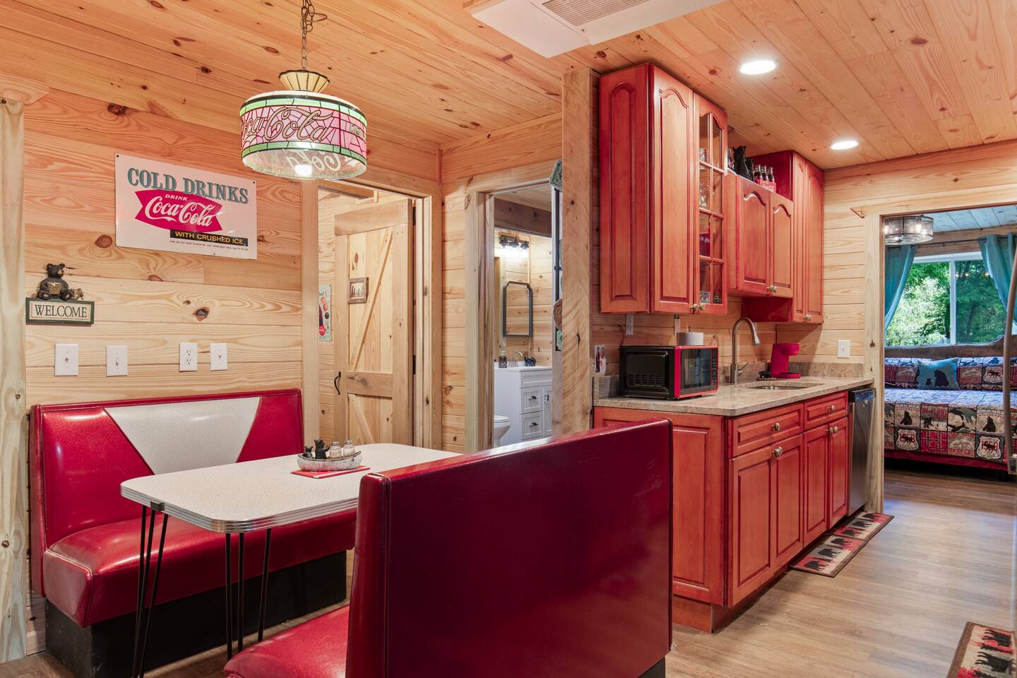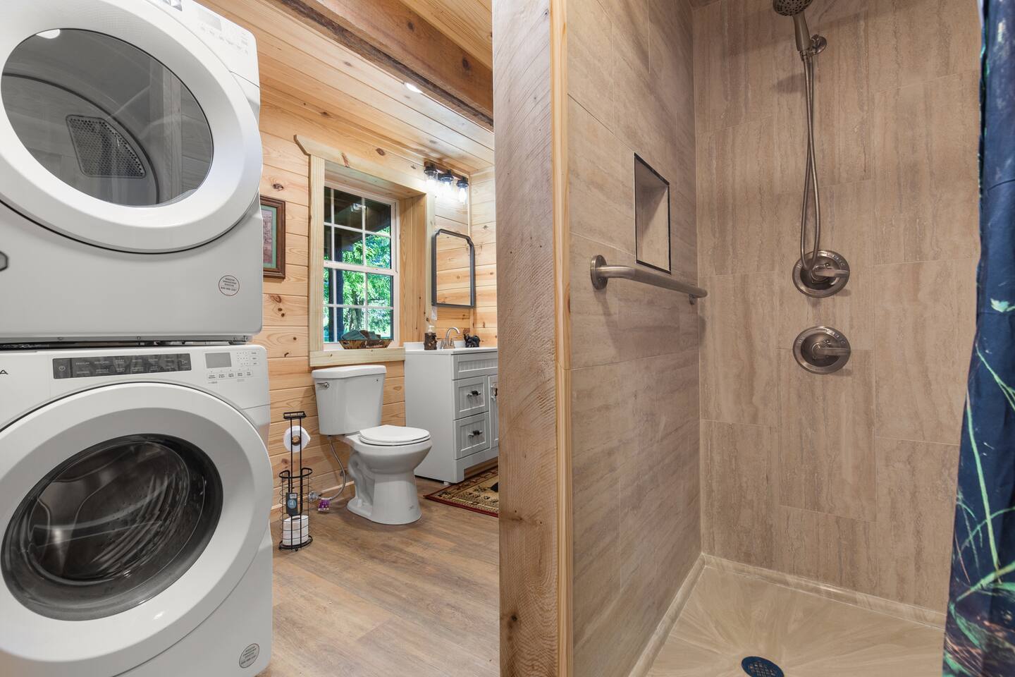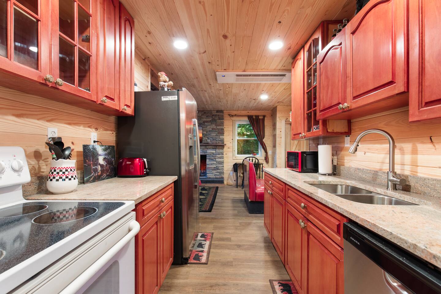 1 bedroom, 1.5 bath entire ground-floor hideaway, below a split-level log cabin. Easy access. No scary roads! 1 king bed, and 1 queen sofa bed., with TV in each sleeping space. Private driveway/entrance, large covered front porch, 1.5 miles to historic Harrisburg Bridge, 3 miles to tubing, 8 miles to Dollywood, 12 miles to The Island/ Pigeon Forge, 15 miles to Buc-ee's, 17 miles to Aquarium/Gatlinburg, 18 miles to GSM Nat'l Park Porter Trailhead, and 32 miles to Pigeon River rafting .