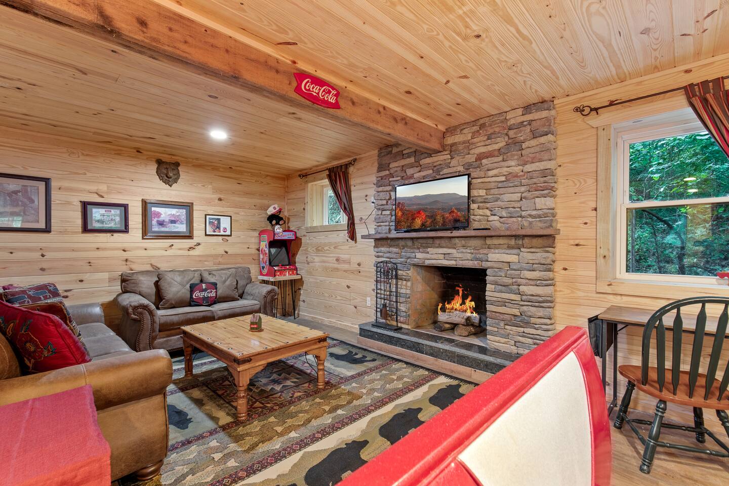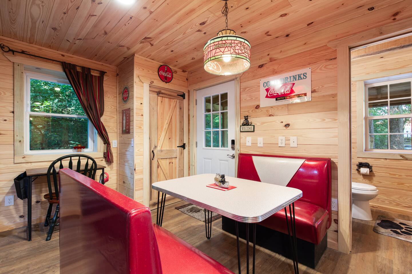 Ground floor hideaway of 30+ year old cabin, flanked by trees. Private drive/entrance, 1.5 baths, 1 bedroom with king size bed, Living room with Queen Sleeper sofa, Wood-burning fireplace, 2 smart TVs, Full kitchen, Dining booth, Workstation, all tongue and groove walls and ceiling, Arcade machine with 412 games, board games, Maximum 4 people overnight, Pets allowed with pre-approval.